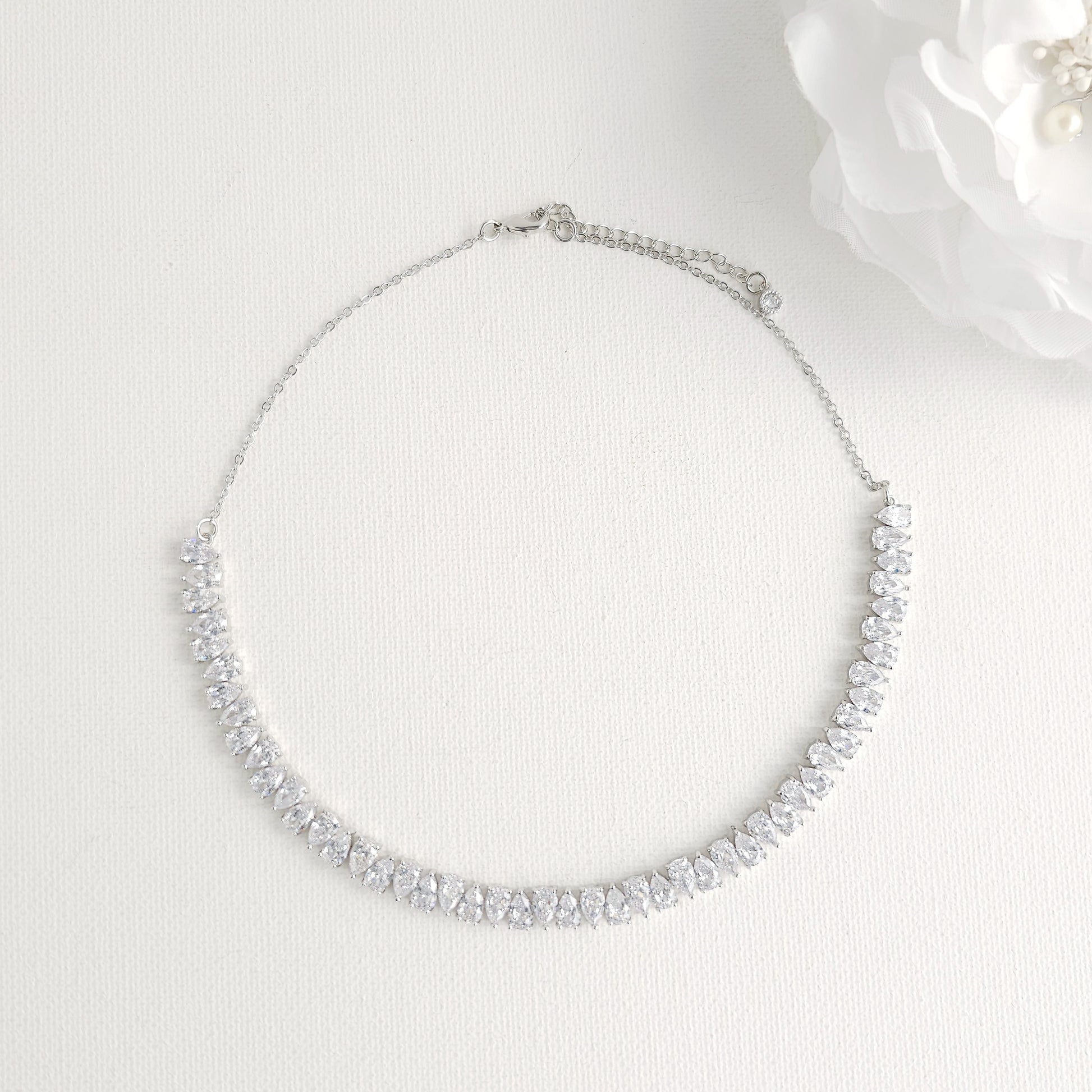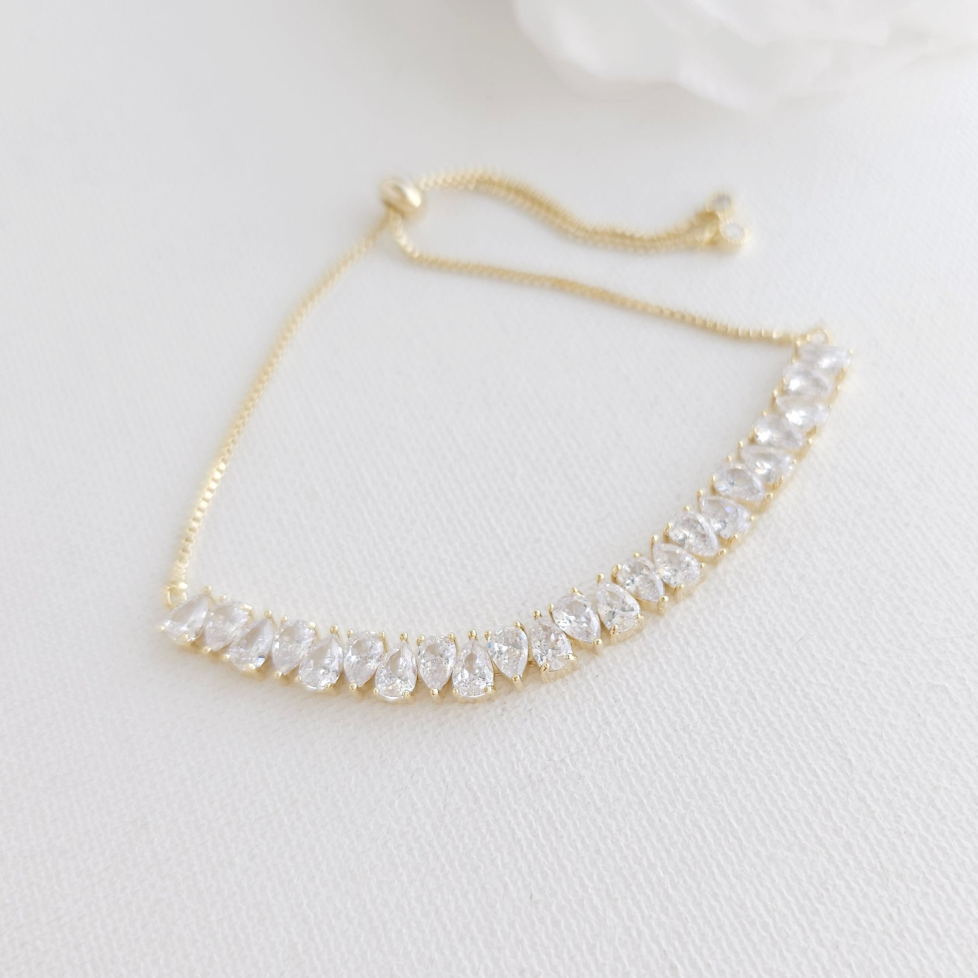 This is a complete, 3 Piece Gold Jewelry Set designed to provide an elegant, polished look without the hassle of matching separate pieces. Each element—the choker, the drop earrings, and the bracelet—is crafted with brilliant small teardrop CZ stones in a high-impact tennis style, plated in gold, ensuring a flawless statement from head to wrist.