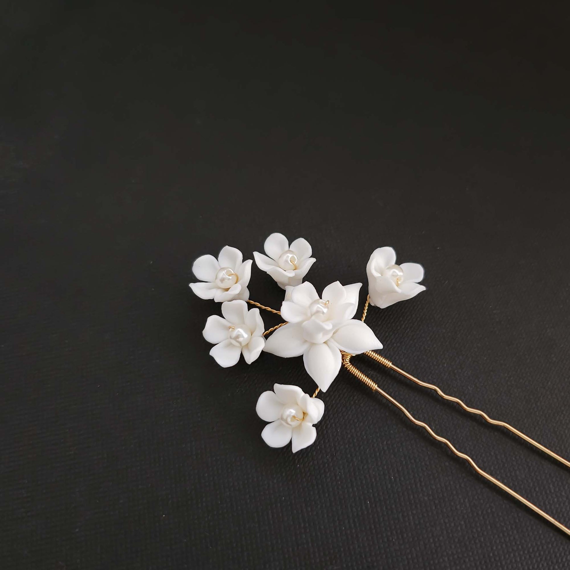 Craftsmanship & Design: Each hairpin is a miniature work of art, featuring five pure white ceramic flowers, each with a single luminous pearl at its heart. The wire-wrapped in three finishes of silver, gold, and rose gold-plated wire, the design ensures the pins are flexible and can be easily adjusted and secured for a custom fit in any hairstyle on your wedding day.