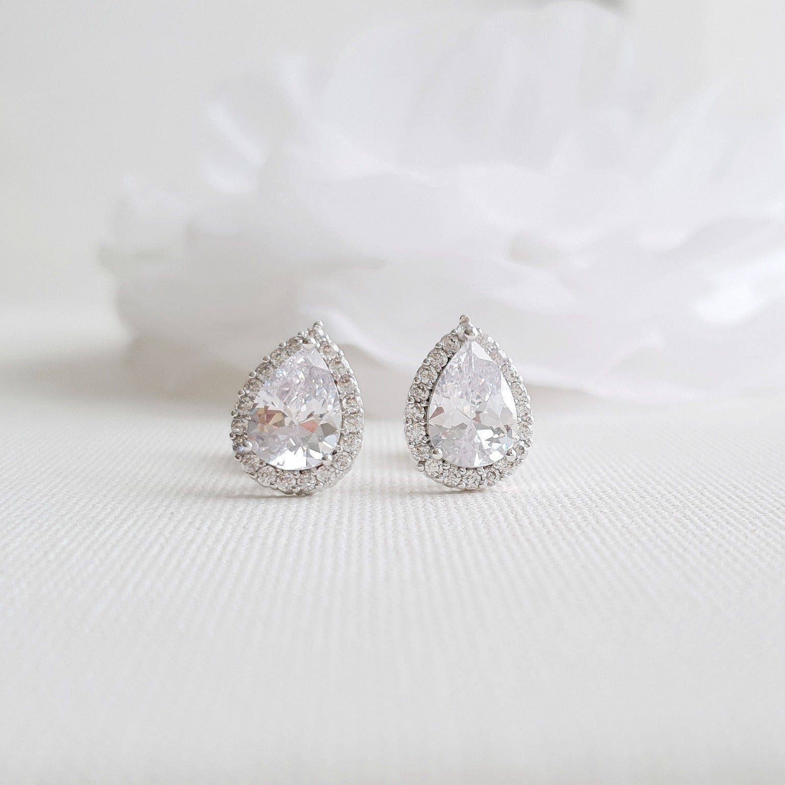 If you need a stud earring for non pierced ears, here is sparkly, perfectly sized, teardrop clip-on bridal stud earrings for weddings, brides, bridesmaids, formal and prom,