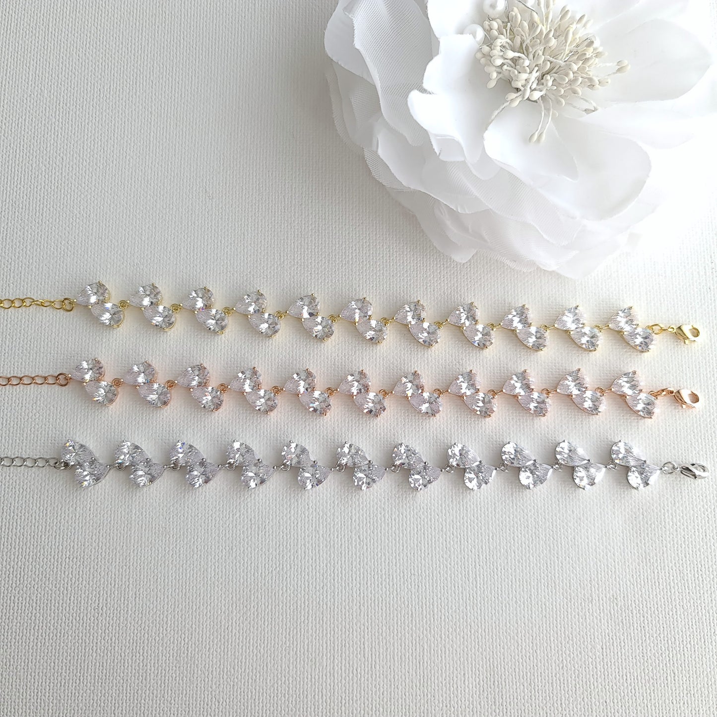 Bracelet-The bracelet features a unique leaf-like alternating design with small teardrop cubic zirconia crystals, creating a traditional and timeless look. Measurement- The bracelet is 6 5/8 inches or 17 cm long with an additional 3 cm extension chain. The width of the bracelet is 1/2 an inch.