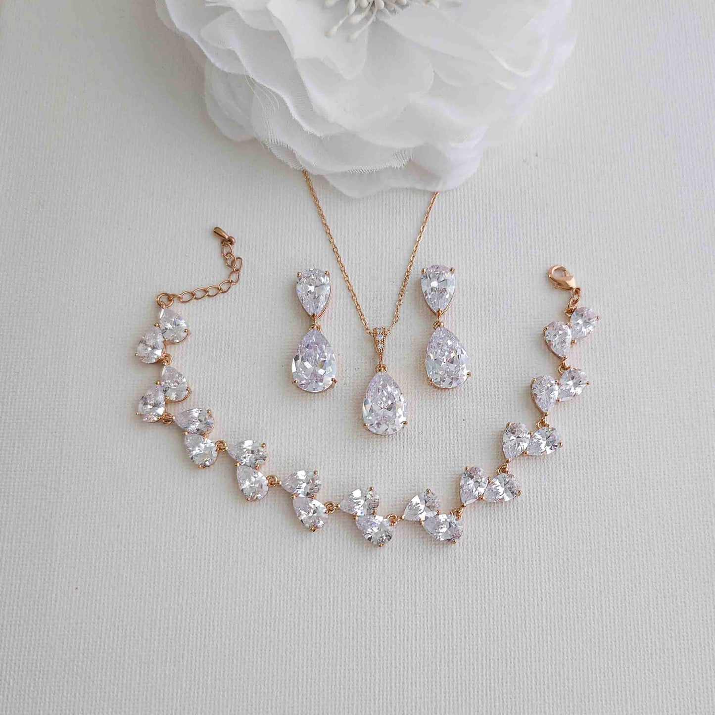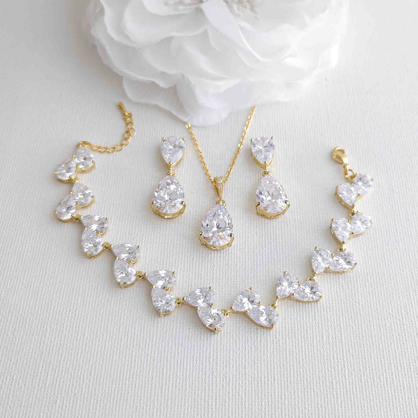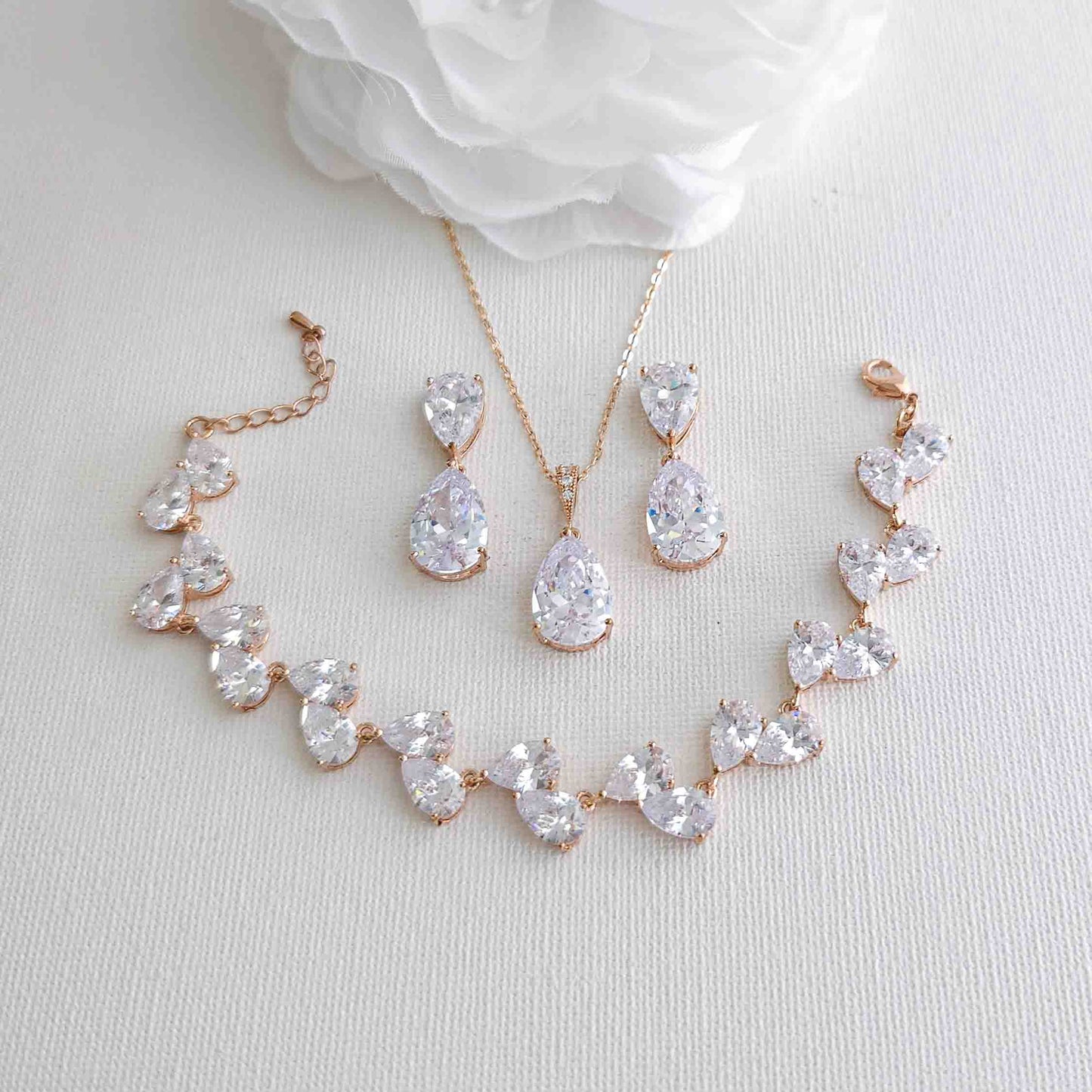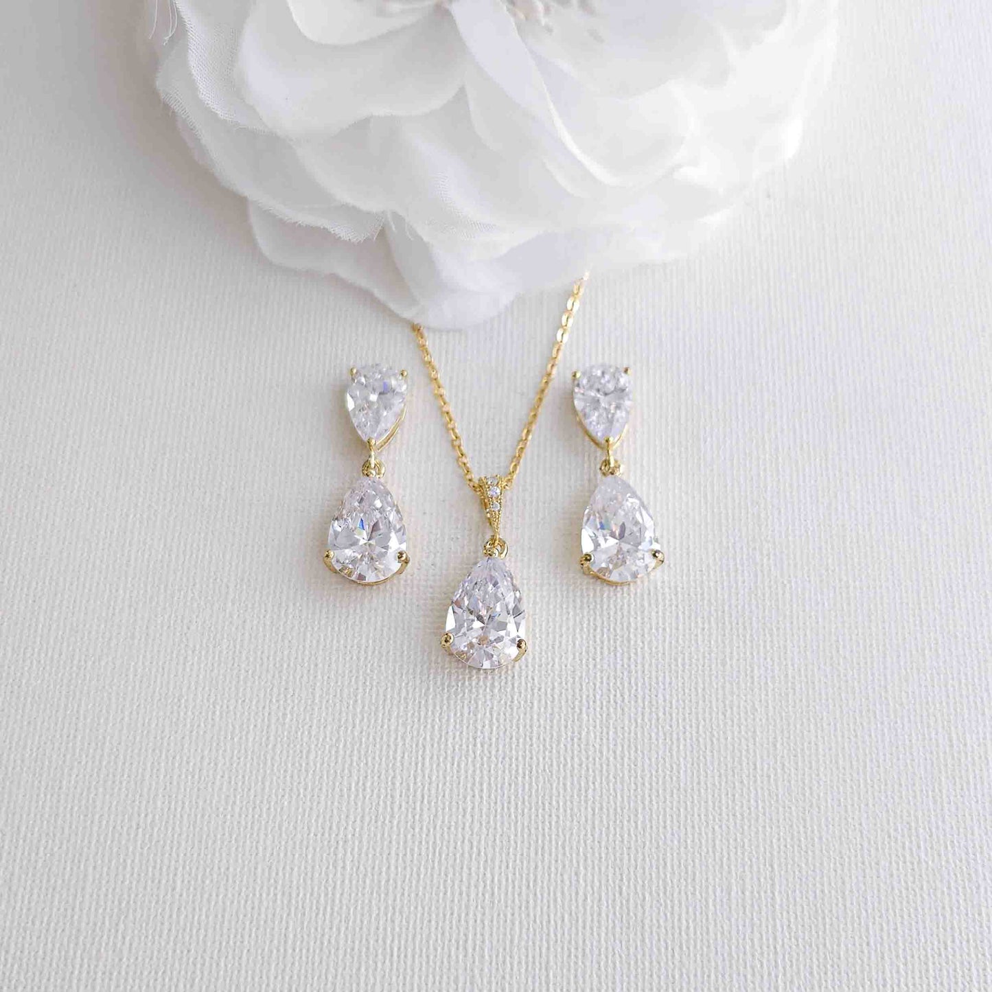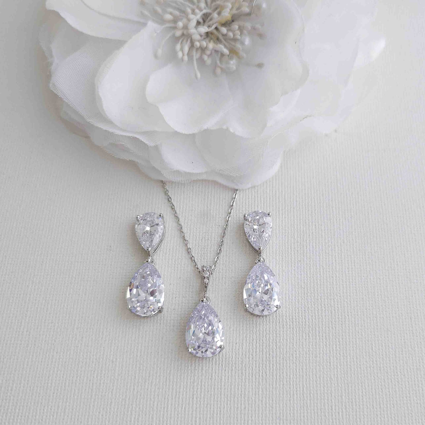 Choosing the right jewelry for your wedding day can be challenging, but this jewelry set is a perfect choice if you want a simple design that isn't over-accessorizing. If you want to add sparkle and brilliance like a diamond, this set is made with high-quality cubic zirconia stones. If you're looking for a traditional and timeless teardrop shape, this CZ jewelry set is perfect for you.