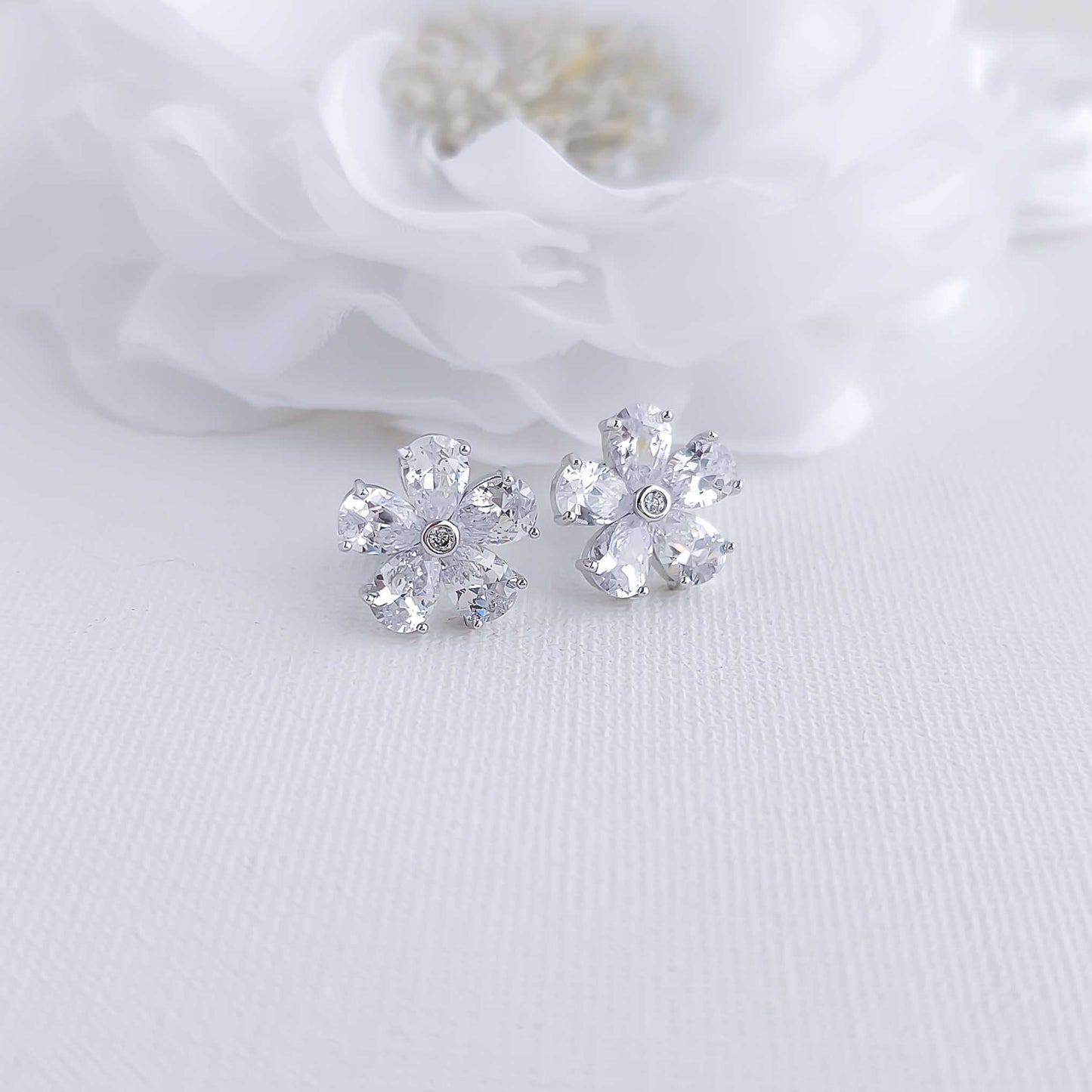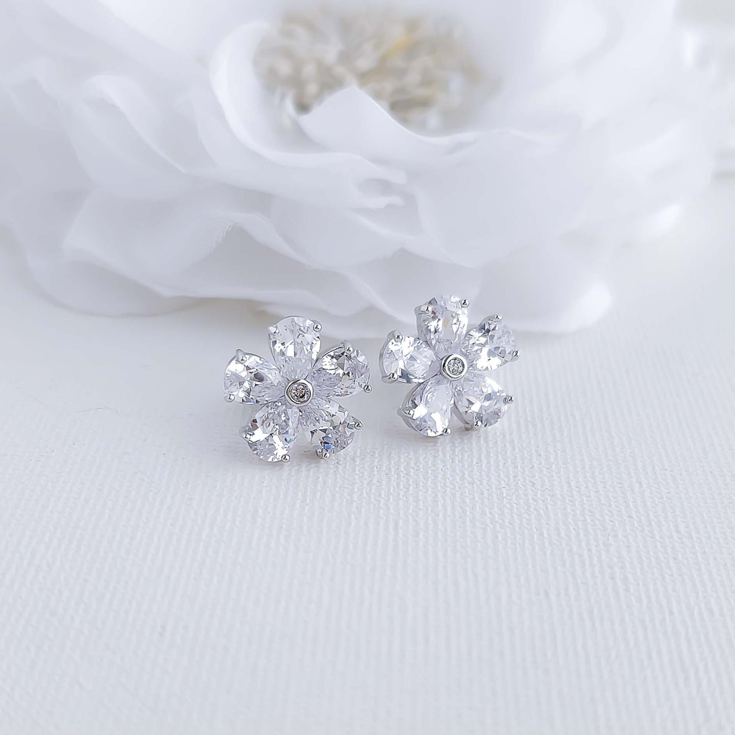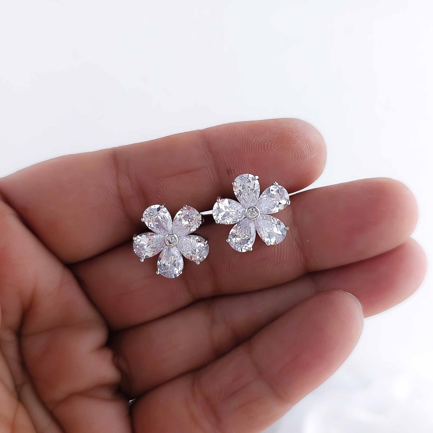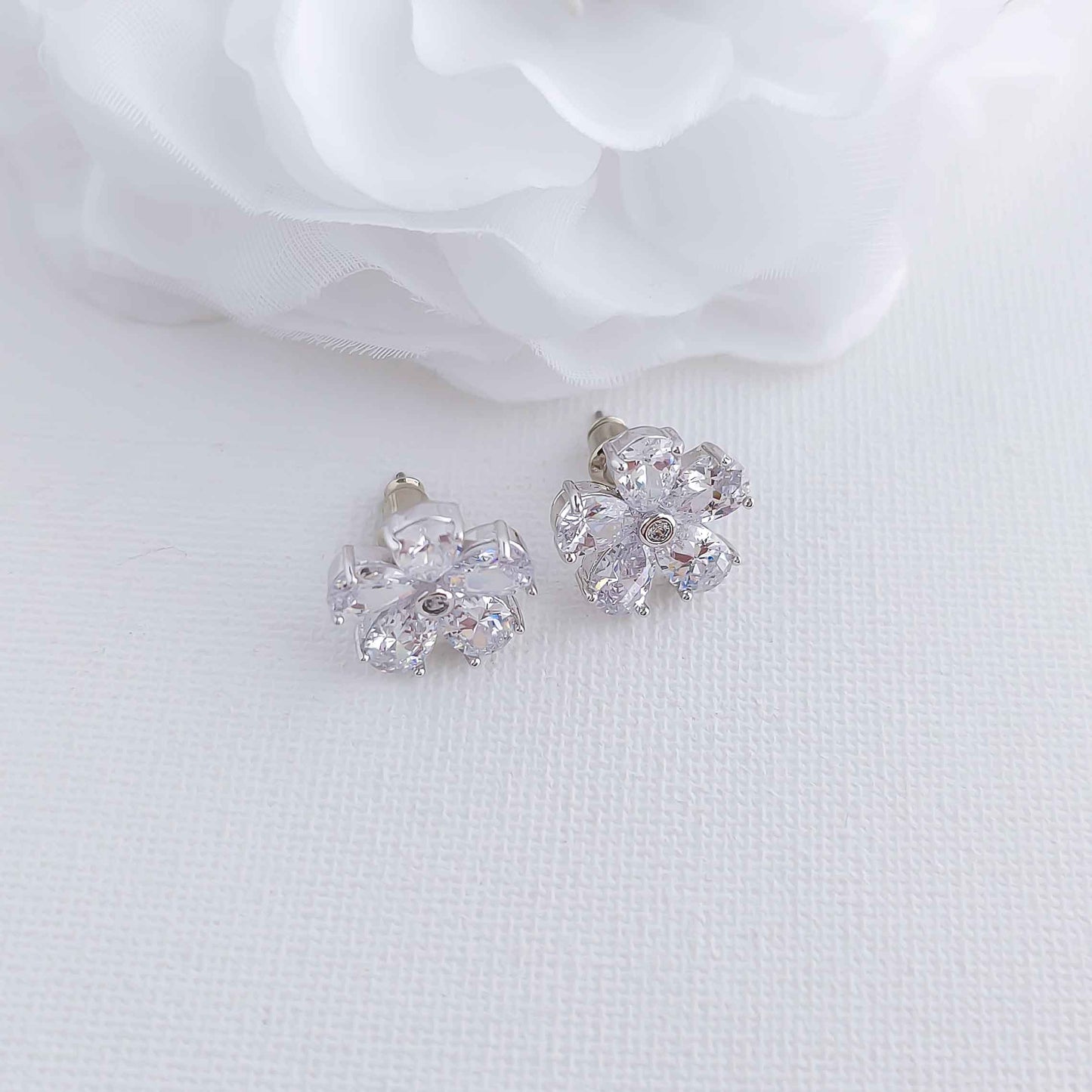 Flower Stud Earrings: The flower petals of the earrings are made of sparkling clear cubic zirconia in a silver finish.