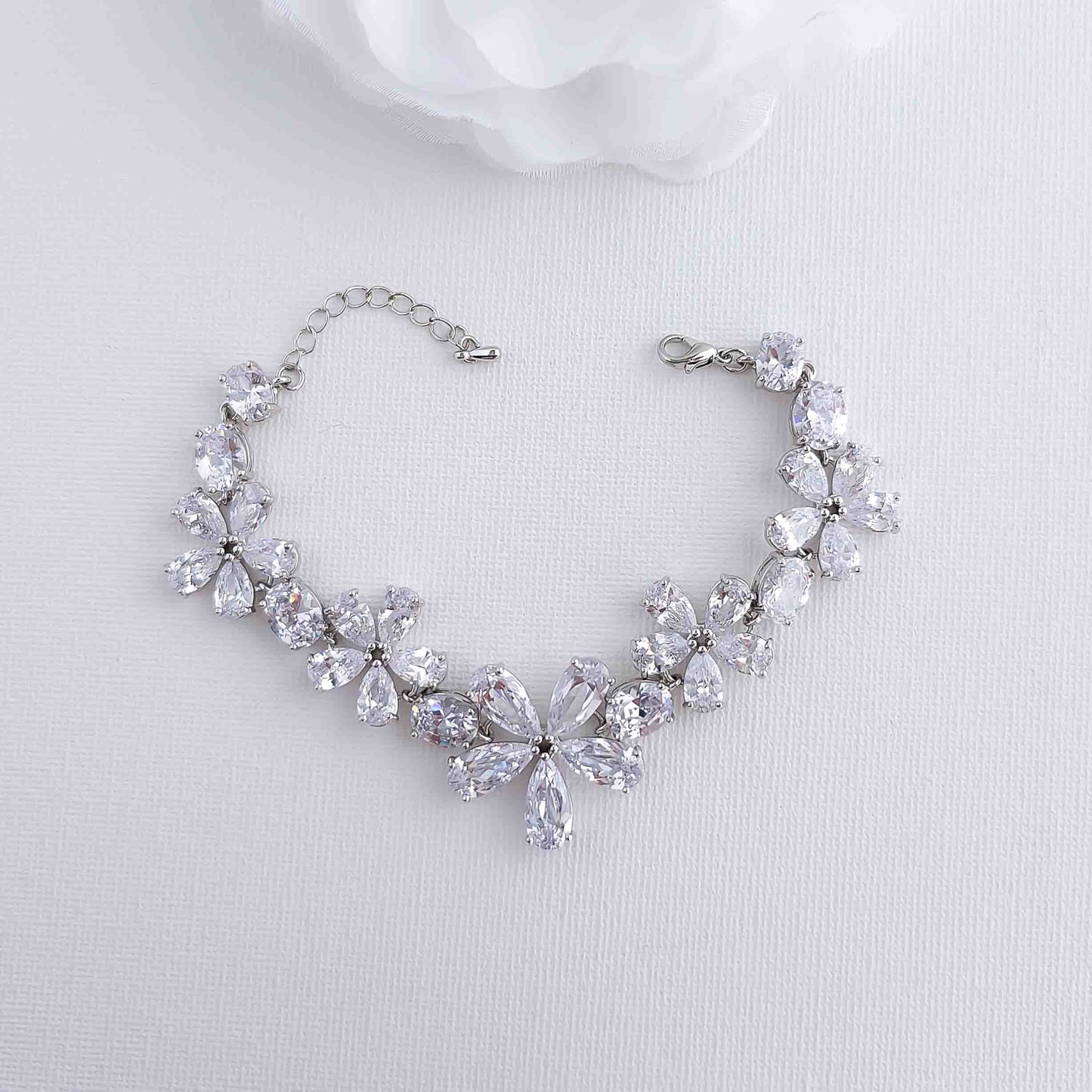Flower Bracelet: Matching the earrings, the bracelet features 5 flowers with a large central flower. The bracelet is secured firmly with a lobster clasp and is adjustable with an extension chain."