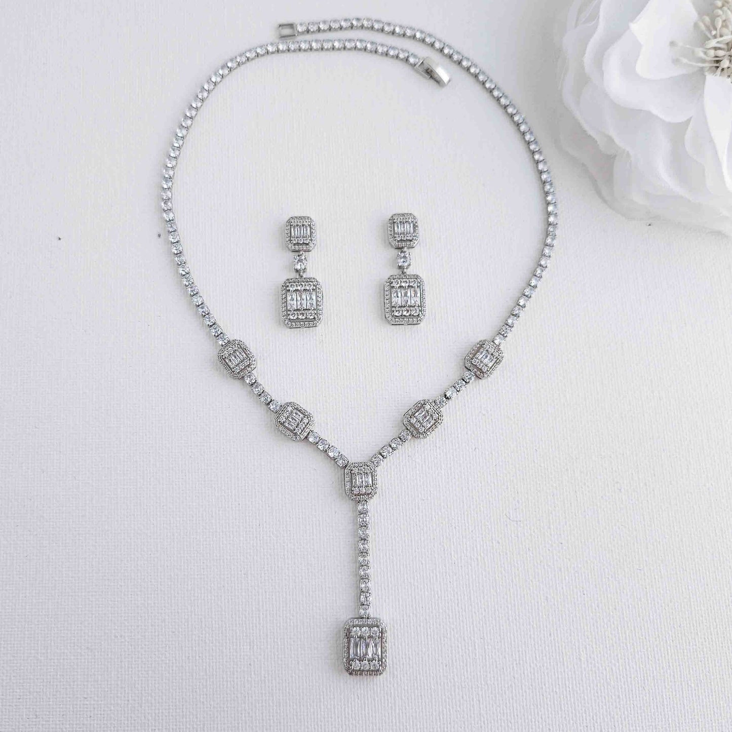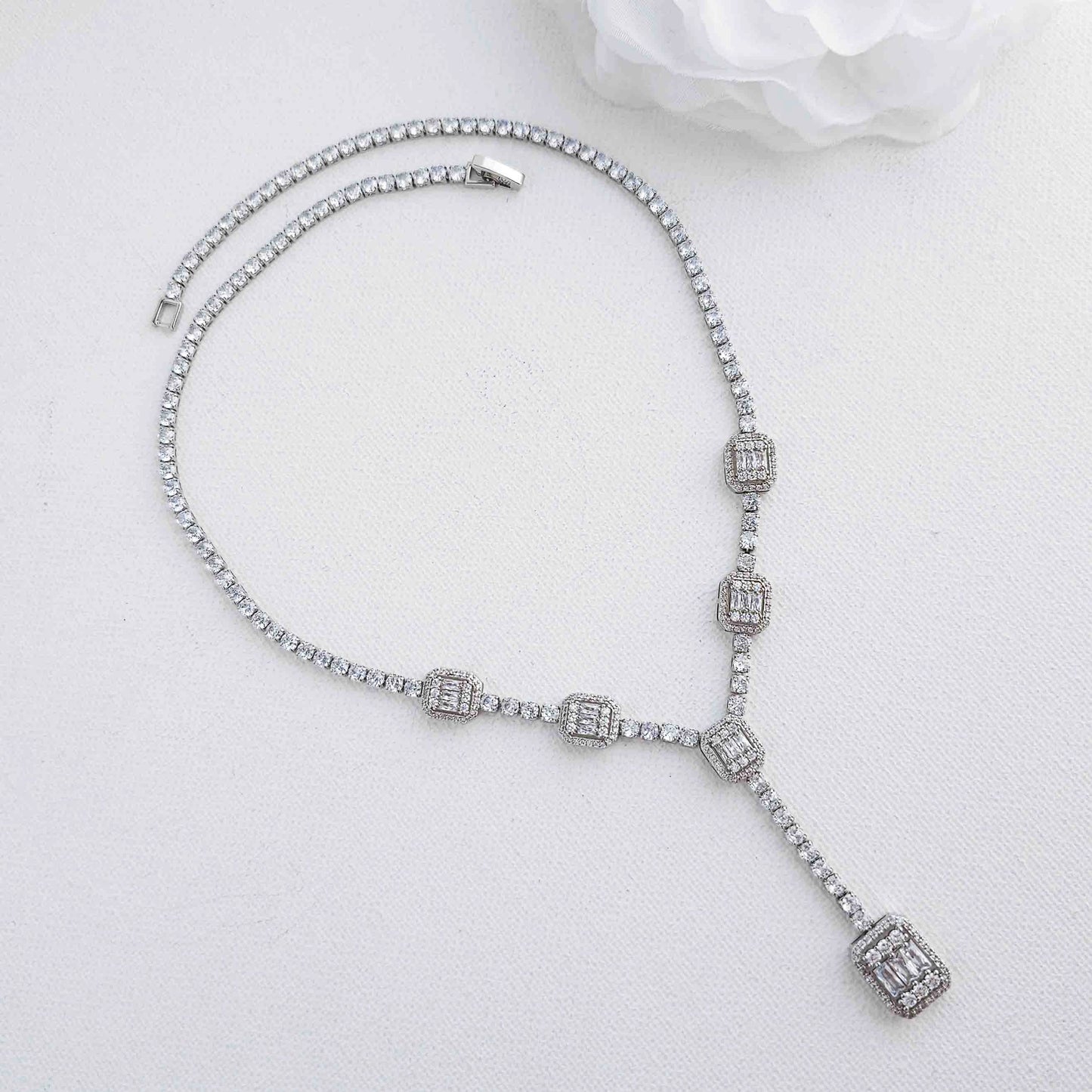 The beautiful T-drop long pendant and chain are further enhanced with small round CZ crystals, delicately interspersed with intricate rectangular art deco drops, the necklace is yellow gold plated with clear cubic zirconia with a secures well with a fold-over clasp for a comfortable fit. The necklace can be purchased in silver and rose gold tones too to suit your style and dress.