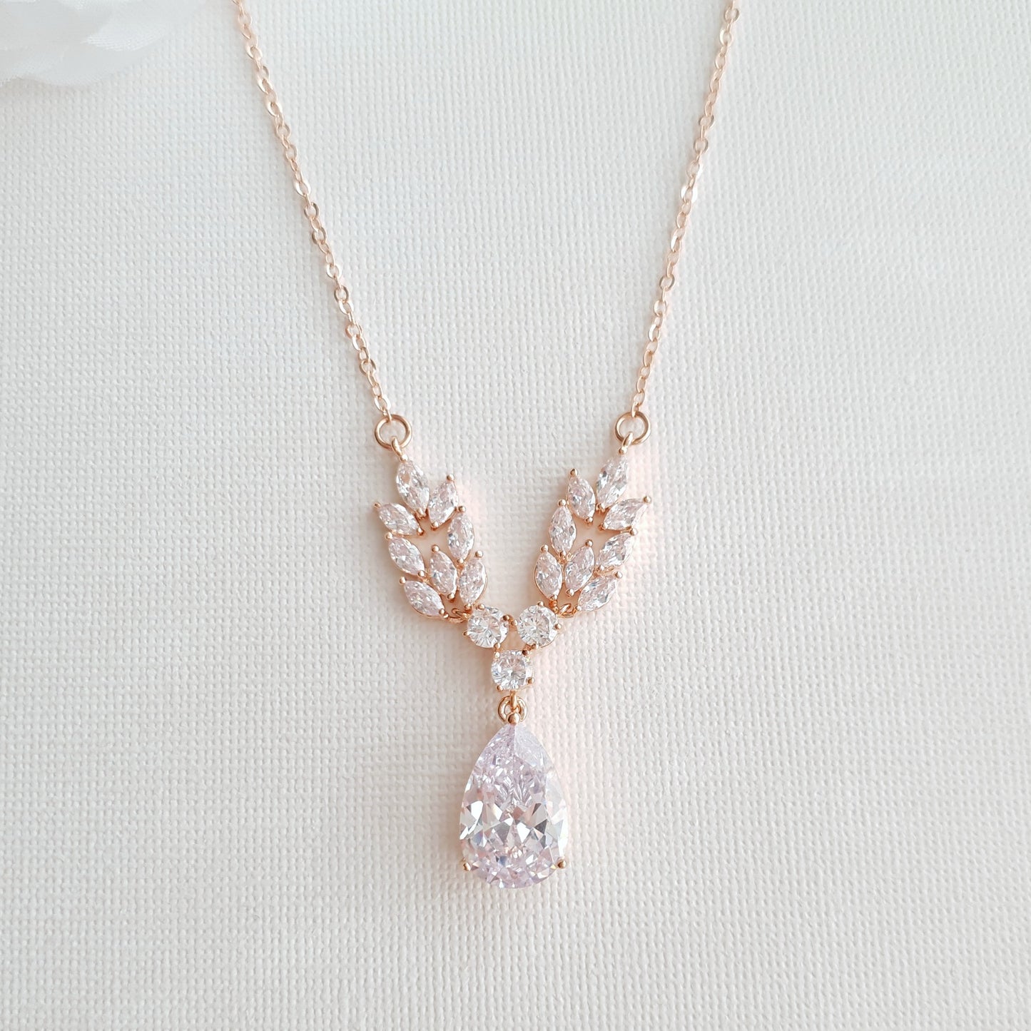 The necklace is created with cubic zirconia leaf and teardrop crystals put onto a chain. I have the necklace also available accented with two pearls if you want to add a soft edge to this necklace design. You can select the option required in the style drop-down menu with or without pearls and colors to suit your needs. The material used is rose gold plated on brass, high-quality cubic zirconia, and pearls.