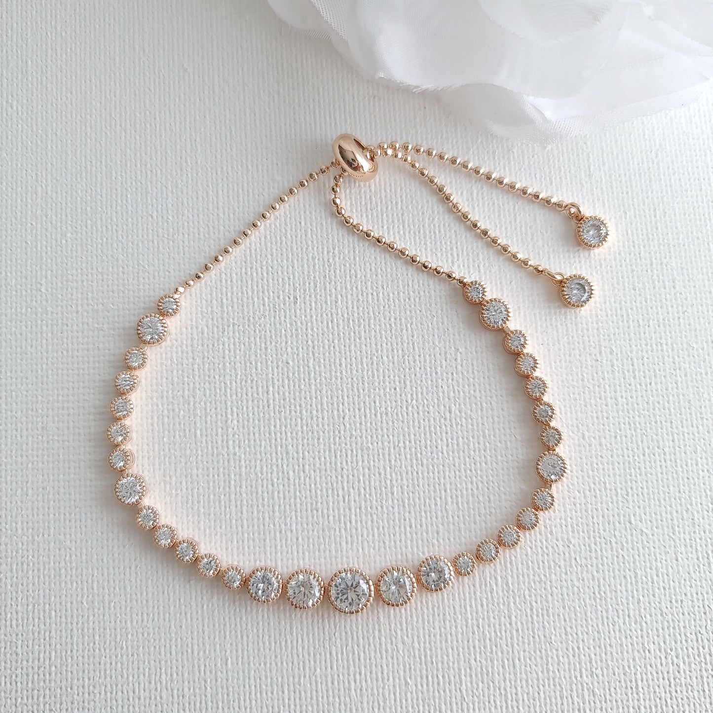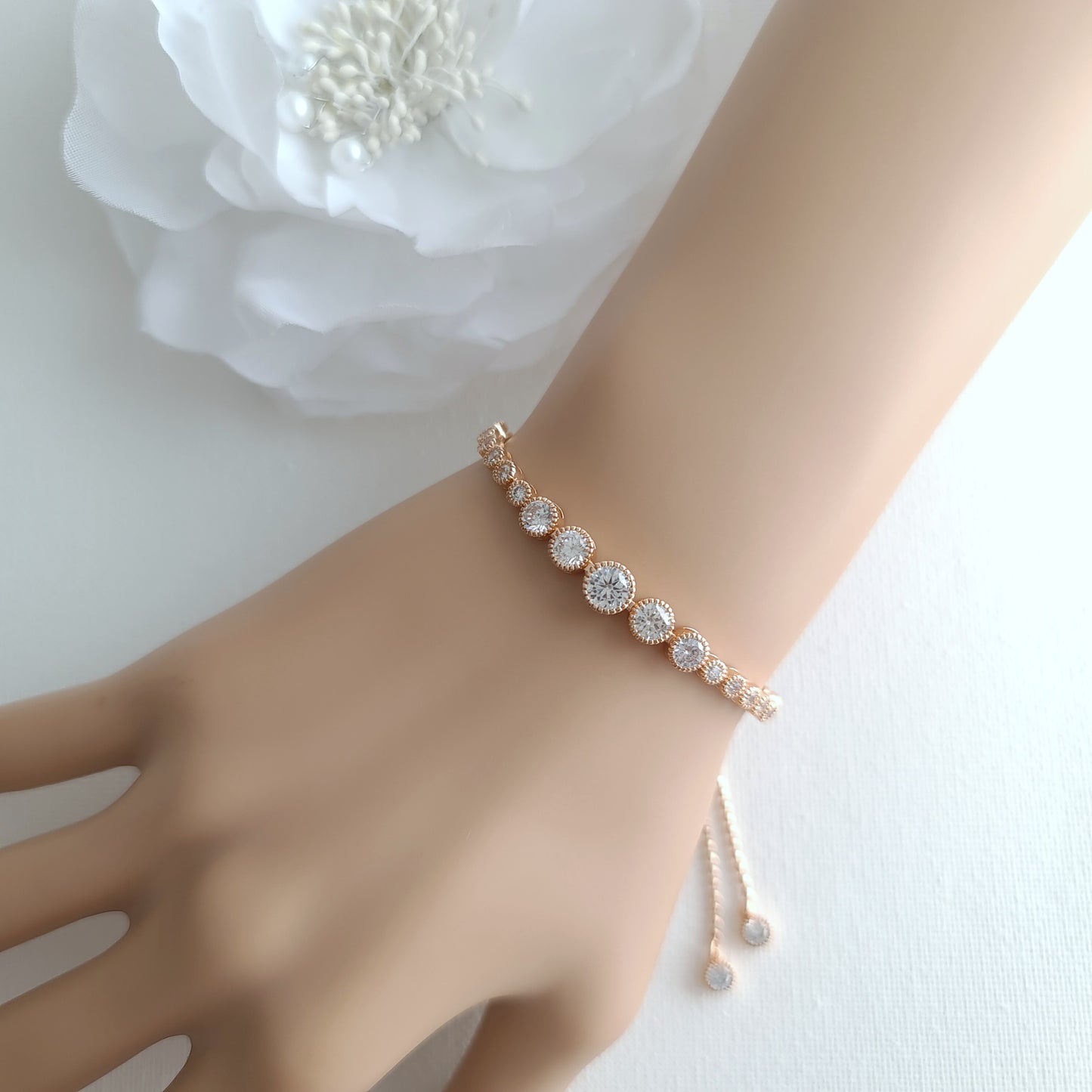 This pretty tennis bracelet style is adjustable to fit any wrist size with the slider clasp. They are available in gold, rose gold, and silver colors. Great for all occasions after the wedding. A wonderful gift that will be cherished.