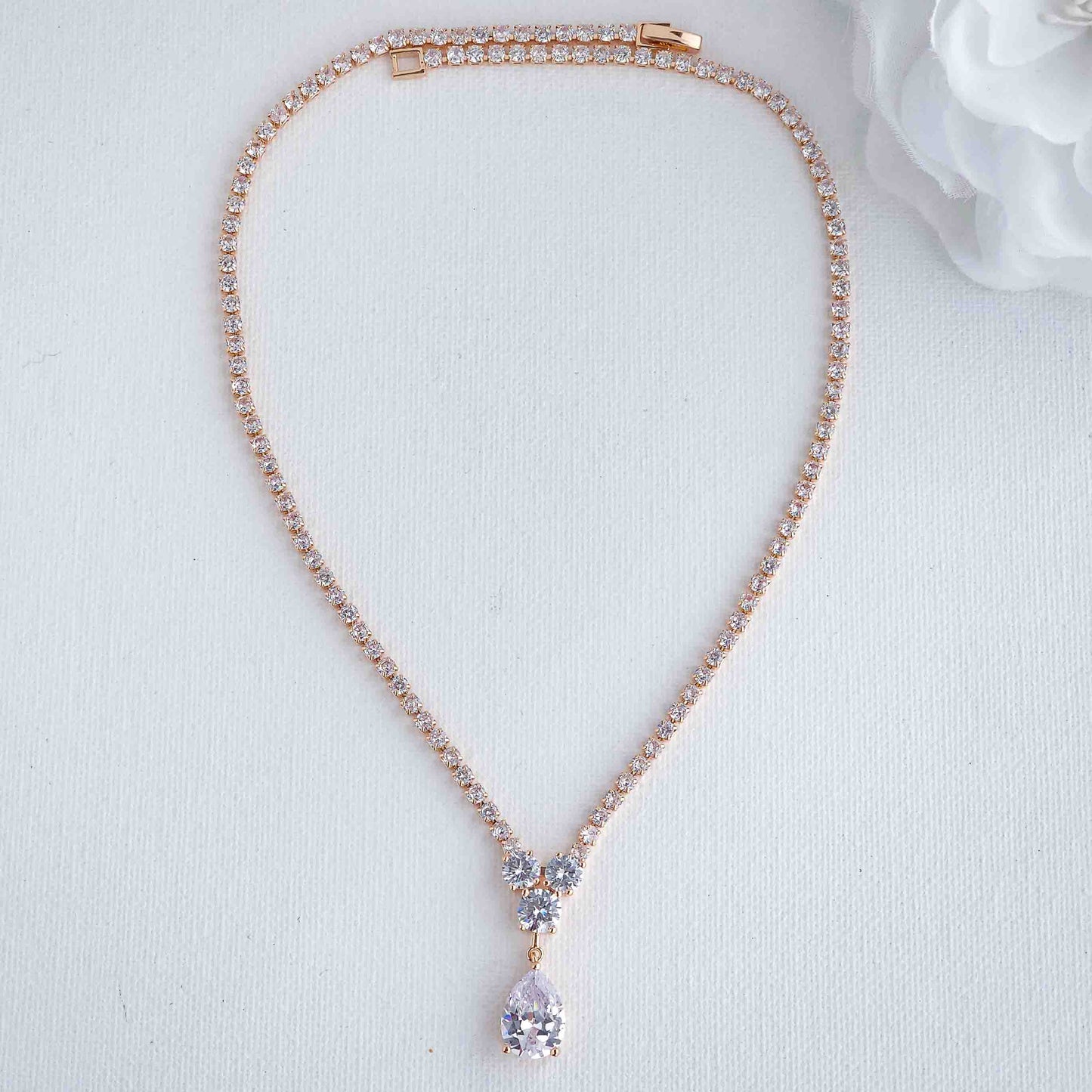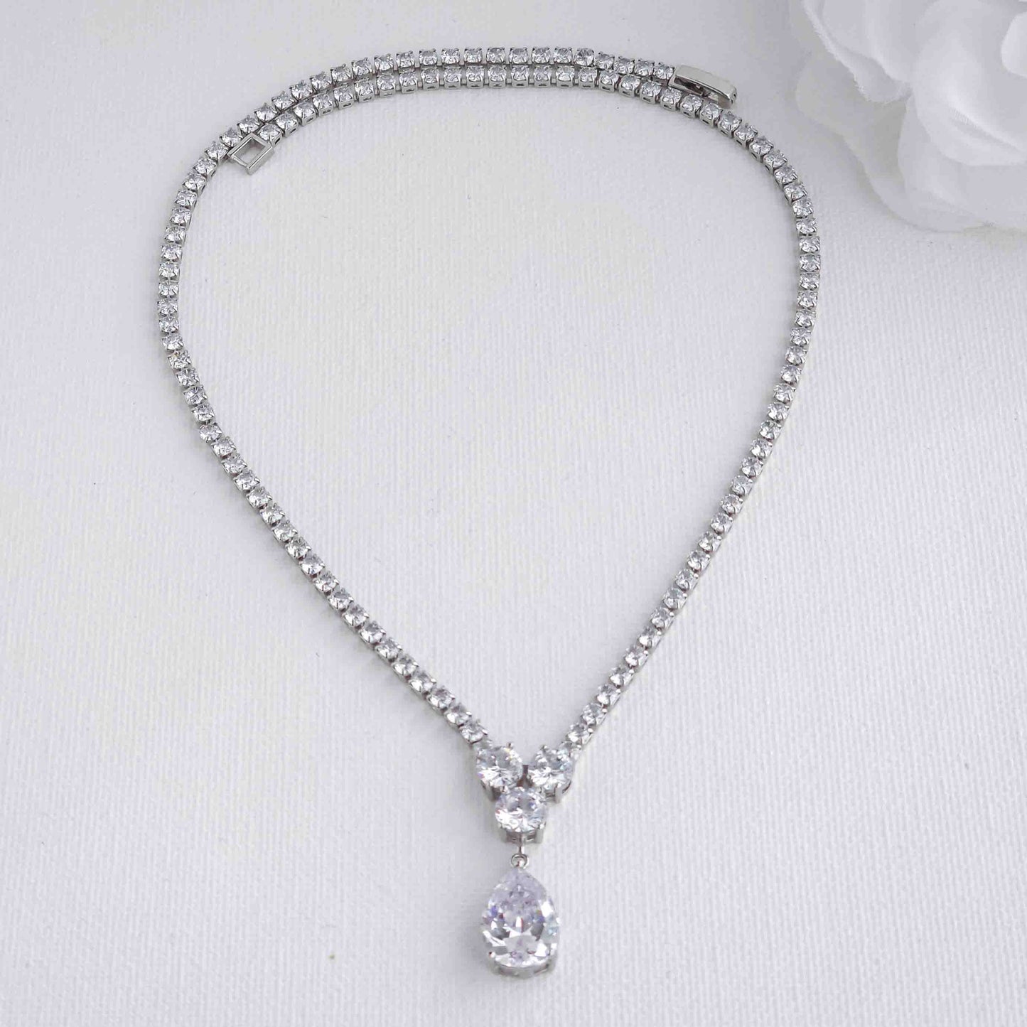 This style of silver CZ necklace is rhodium plated and available in other finishes yellow gold in 18K gold plating and rose gold plated colors, with a secure fold-over or snap-lock clasp, it stays in place throughout the wedding and dance, ensuring a worry-free and comfortable experience.