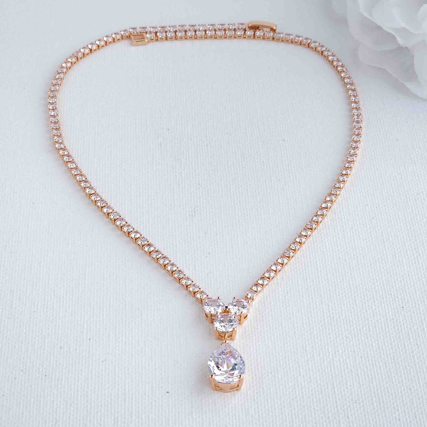 Whether your gown is intricately detailed or elegantly simple, this cubic zirconia wedding necklace will enhance your look. In addition to this priceless aesthetics, the versatility of the CZ necklace does not limit weddings alone, wear it on other special occasions and preserve it in your jewelry box for every special occasion and family gathering after the wedding.
