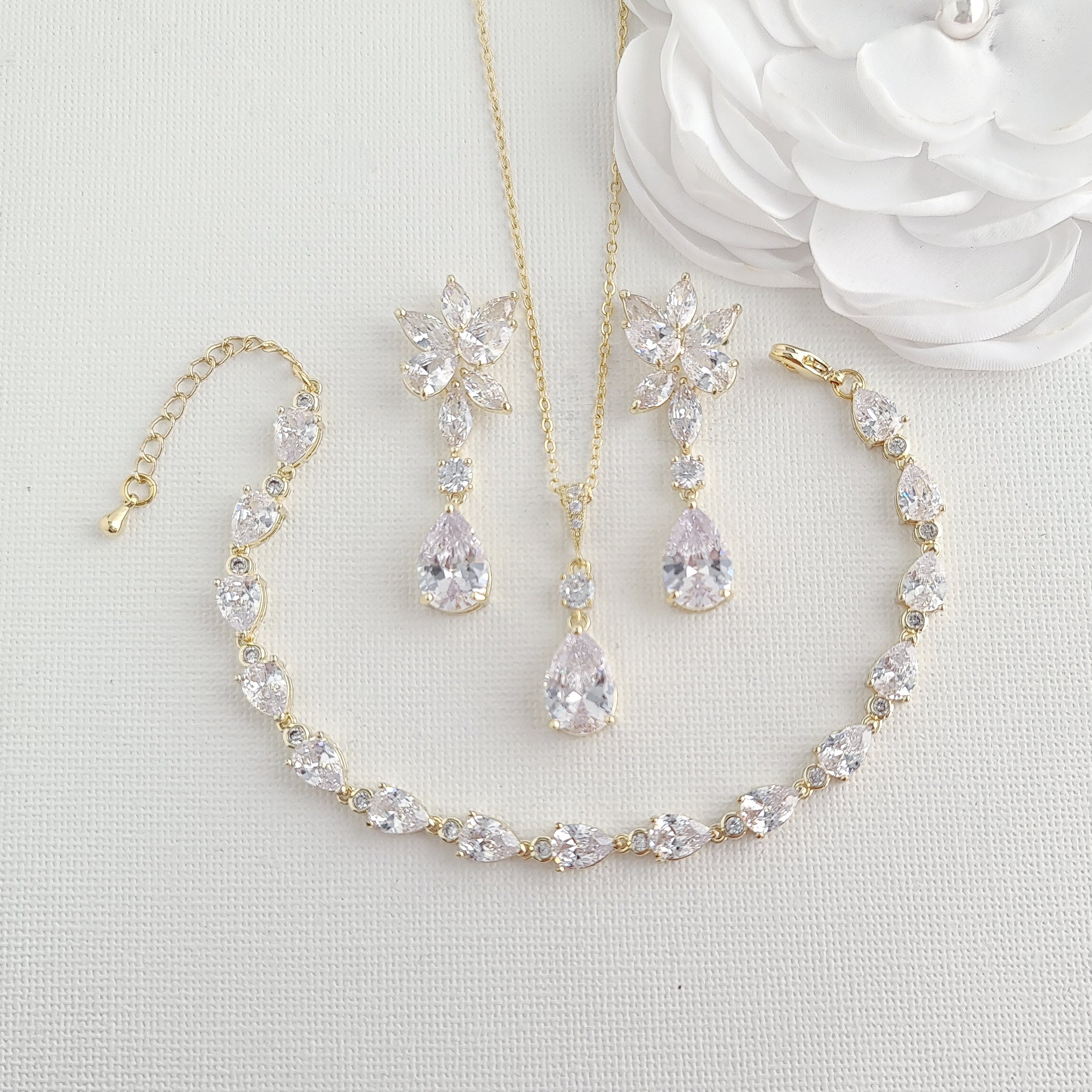 Indulge in timeless elegance with our exquisite bridal jewelry set. Crafted in 14K light gold plating combined with sparkling cubic zirconia, this coordinated gold jewelry set exudes sophistication and sparkle.
