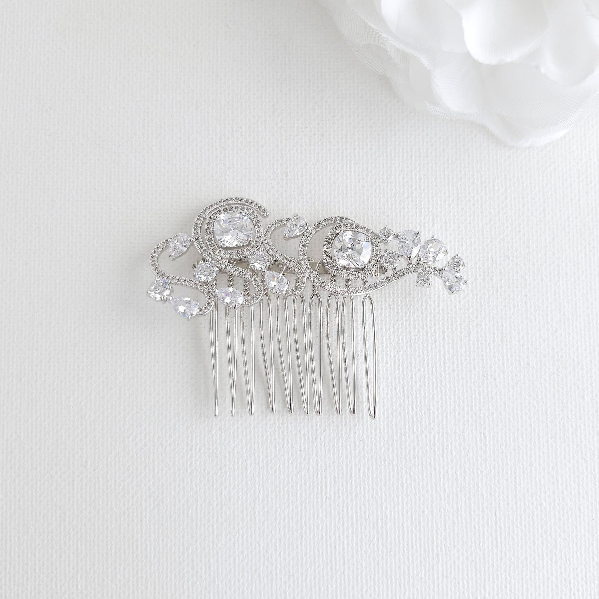 Si vous êtes à la recherche d'accessoires pour cheveux délicats et jolis pour le jour de votre mariage ! découvrez ce petit peigne à cheveux de mariage en or rose. Le peigne à cheveux est scintillant avec des formes tourbillonnantes, rondes, en forme de larme et carrées / losanges, en zircone cubique de haute qualité.