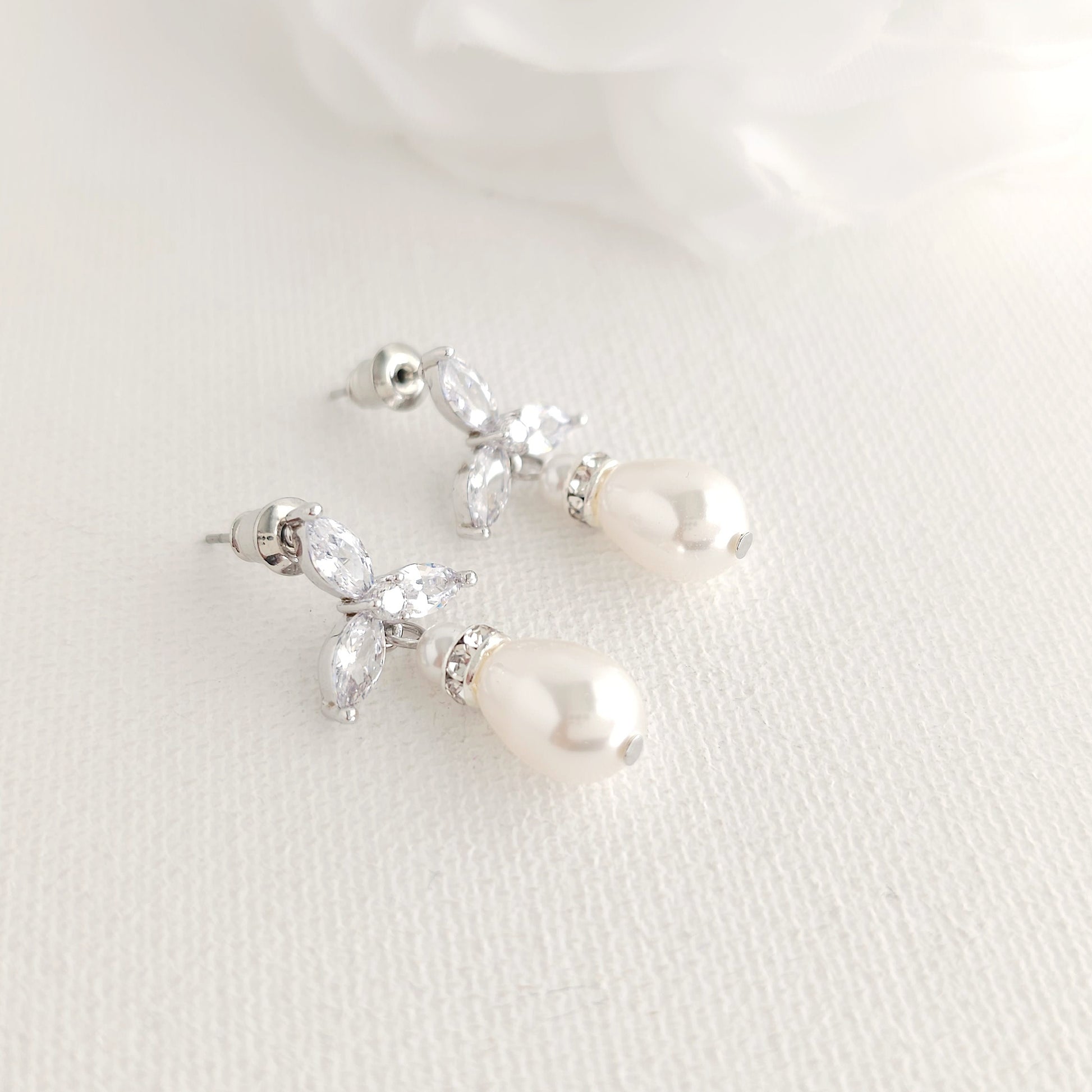 These simple and elegant rose gold flower pearl earrings are perfect for brides. They add a touch of timeless elegance for the bride seeking a minimal yet impactful bridal look on her wedding day. These simple floral and pearl drop earrings are crafted with a sparkly clear cubic zirconia floral ear top and lustrous teardrop pearls. The earring can be purchased in three finishes of rose gold, silver, or gold, and the crystal pearls are white.