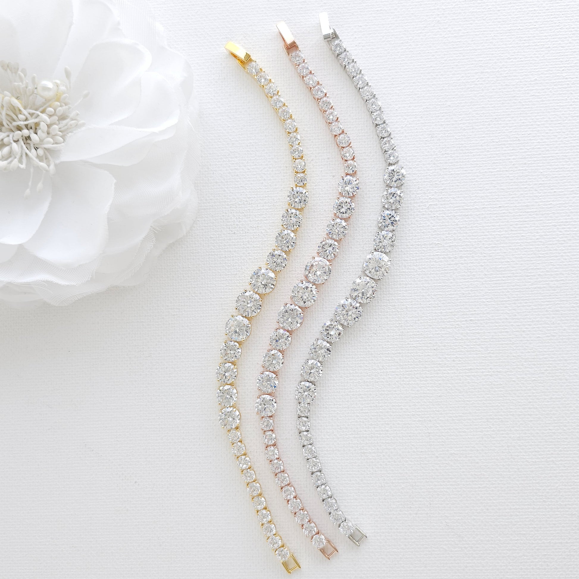 Encircle your delicate wrist with this classic zirconia bracelet for brides Nora. A classic tennis bracelet design made with cubic zirconia in silver tone is just gorgeous and sparkly with your wedding dress. This zirconia bracelet is stylish looking and can be used on every occasion after your wedding. This silver cubic zirconia bracelet measures 6.5 inches or 16.5 cms. Fashionable piece of jewelry to add some extra sparkle to any outfit you wear. Buy yours today! Nora bracelet is also available in rose gold and 14k yellow gold tones to choose from.