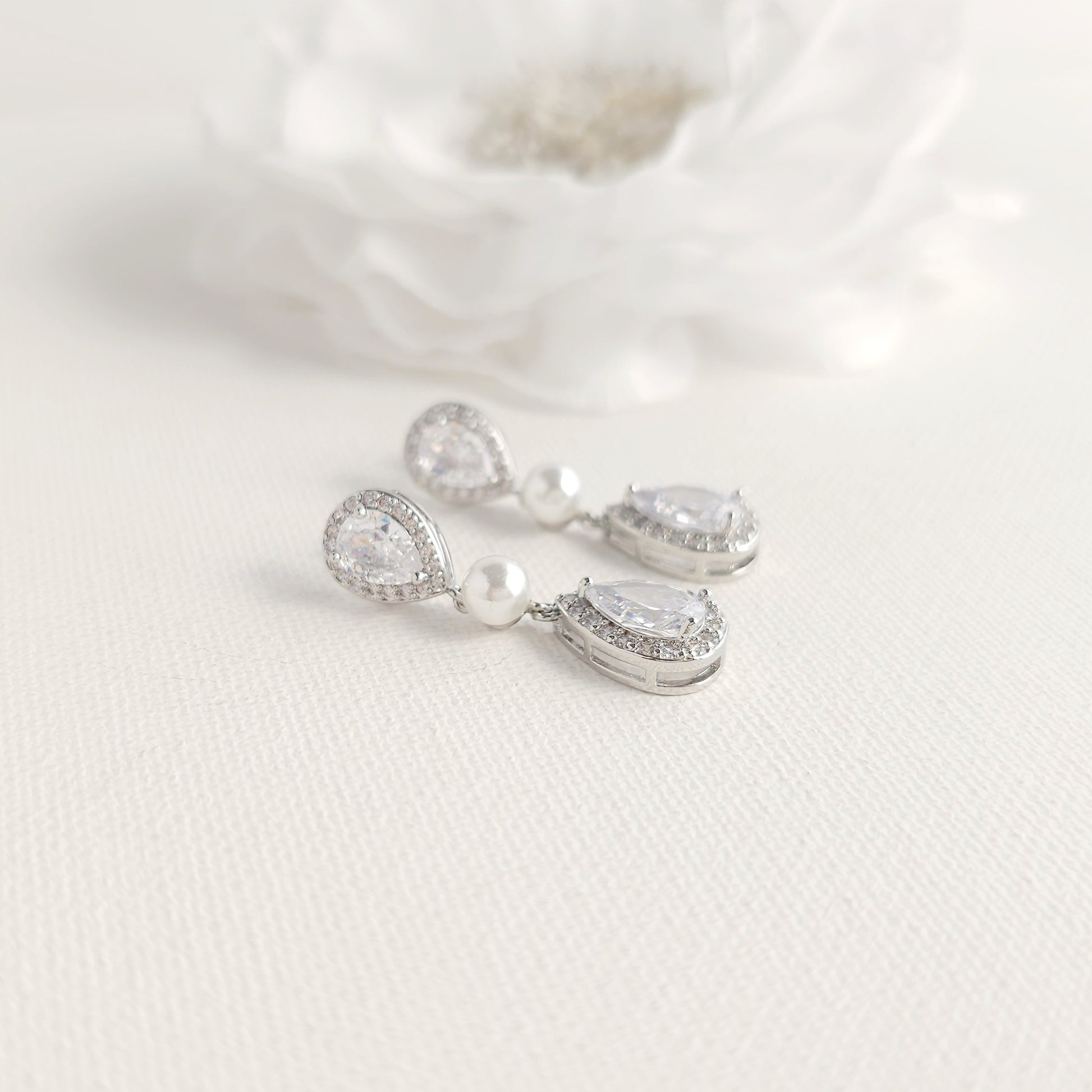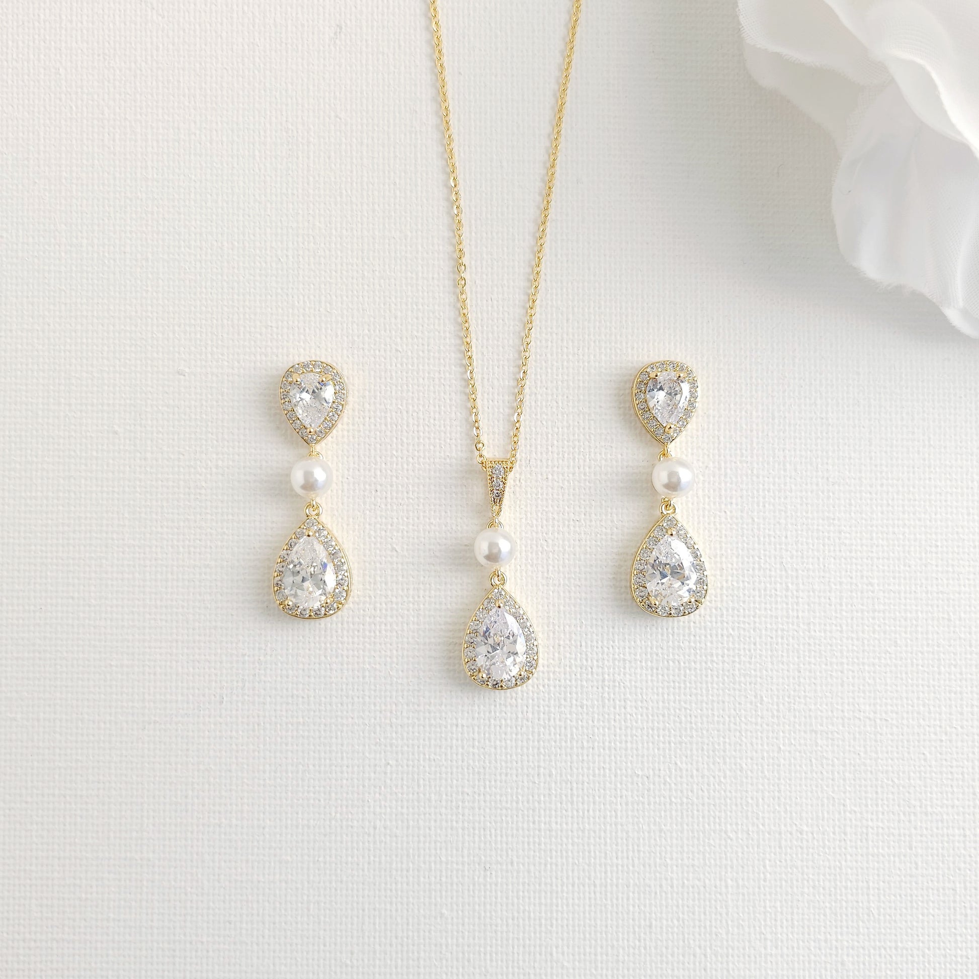 A Pearl & CZ Teardrop Jewelry Set Designed to Add a Warm Tone to Your Wedding Dress