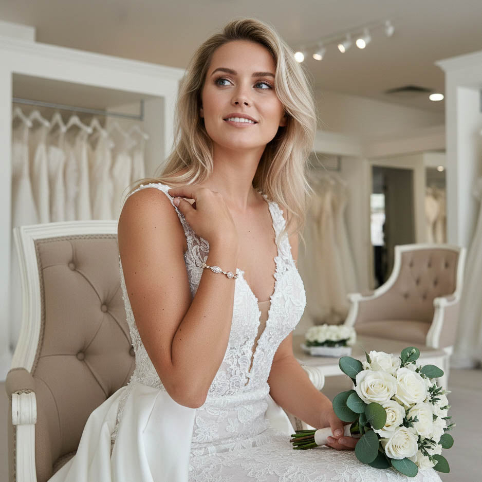 The bracelet is also available with matching long earrings if you have decided to wear bracelets and earrings as a combination on your wedding day. The bracelet can be purchased in three finishes of gold, silver, and rose gold to suit your style.