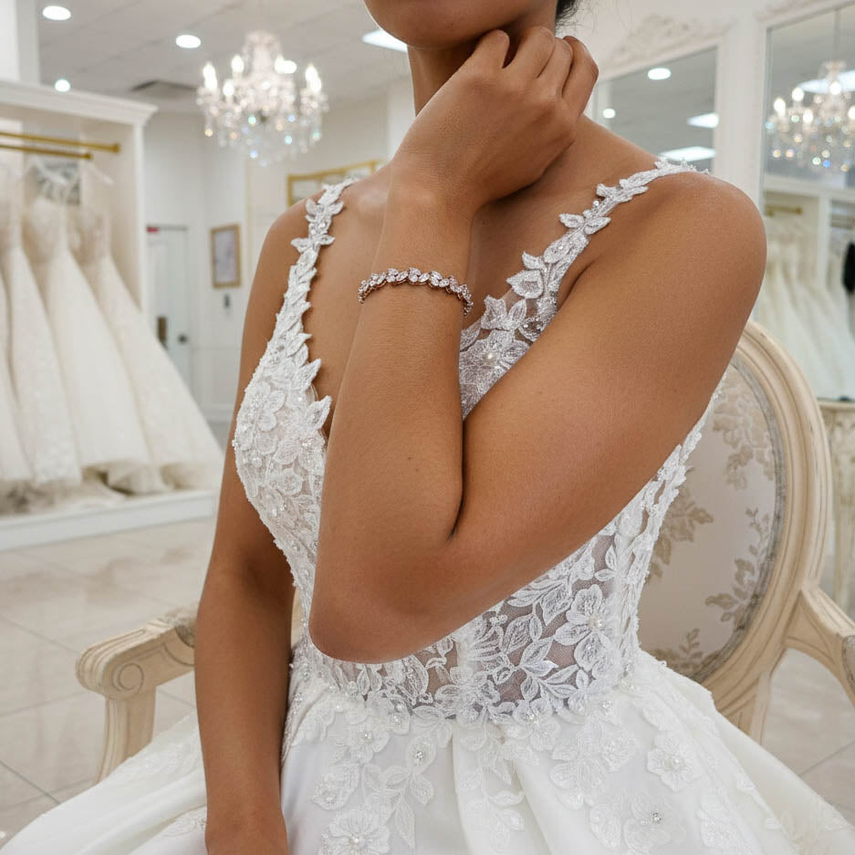 This dainty bridal tennis bracelet is slim and slender and is made of cubic zirconia and 14K gold plating. This leaf-shaped bridal tennis bracelet is also available in silver and rose gold finishes too