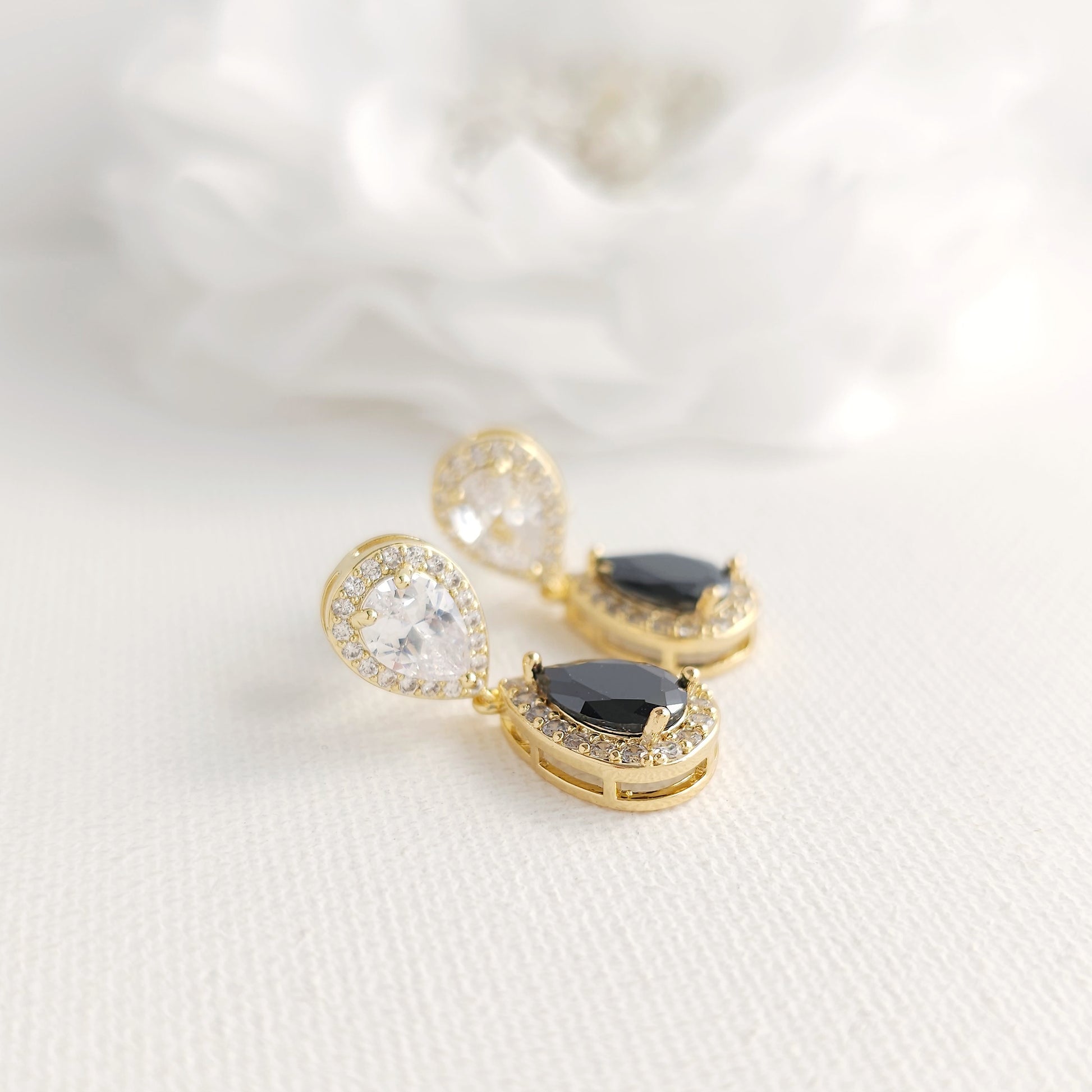 The design features a stunning contrast: a sparkly clear Cubic Zirconia clip top perfectly complements the deep, faceted black teardrop drop. The luxurious gold finish provides a classic setting that elevates the look.